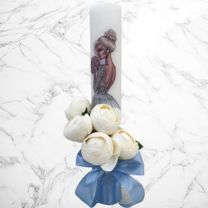 Aceste lumanari sunt decorte cu bujori artificiali albi si fundita bleu si neagra.