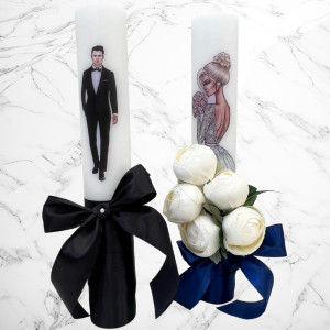 Aceste lumanari sunt decorte cu bujori artificiali albi si fundita bleumarin si neagra.