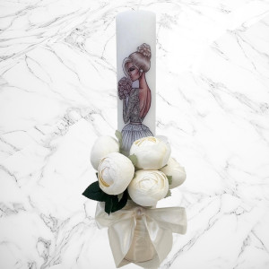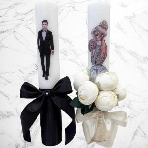 Aceste lumanari sunt decorte cu bujori artificiali albi si fundita ivory si neagra.