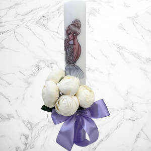 Aceste lumanari sunt decorte cu bujori artificiali albi si fundita lila si neagra.