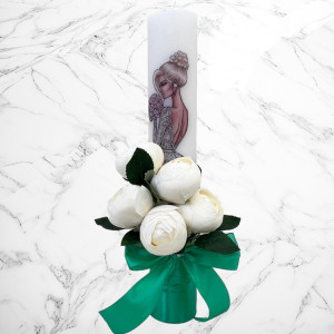 Aceste lumanari sunt decorte cu bujori artificiali albi si fundita verde menta si neagra.