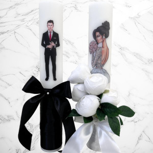 Aceste lumanari sunt decorte cu bujori artificiali albi si fundita alba si neagra.