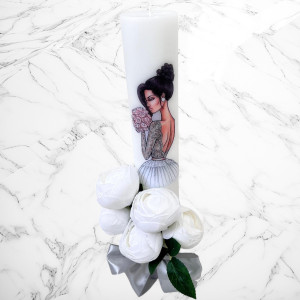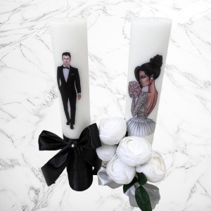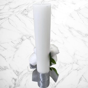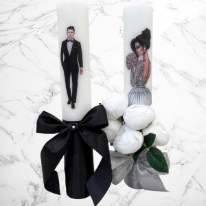 Aceste lumanari sunt decorte cu bujori artificiali albi si fundita argintie si neagra.