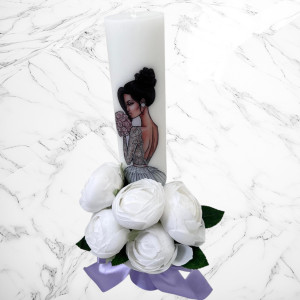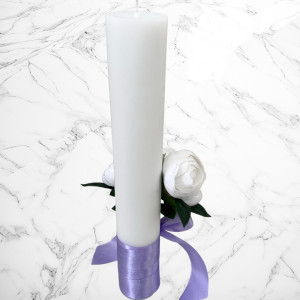 Aceste lumanari sunt decorte cu bujori artificiali albi si fundita lila si neagra.