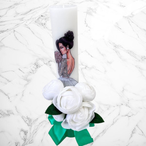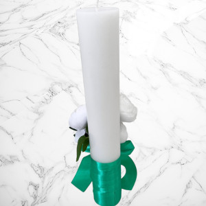 Aceste lumanari sunt decorte cu bujori artificiali albi si fundita verde menta si neagra.