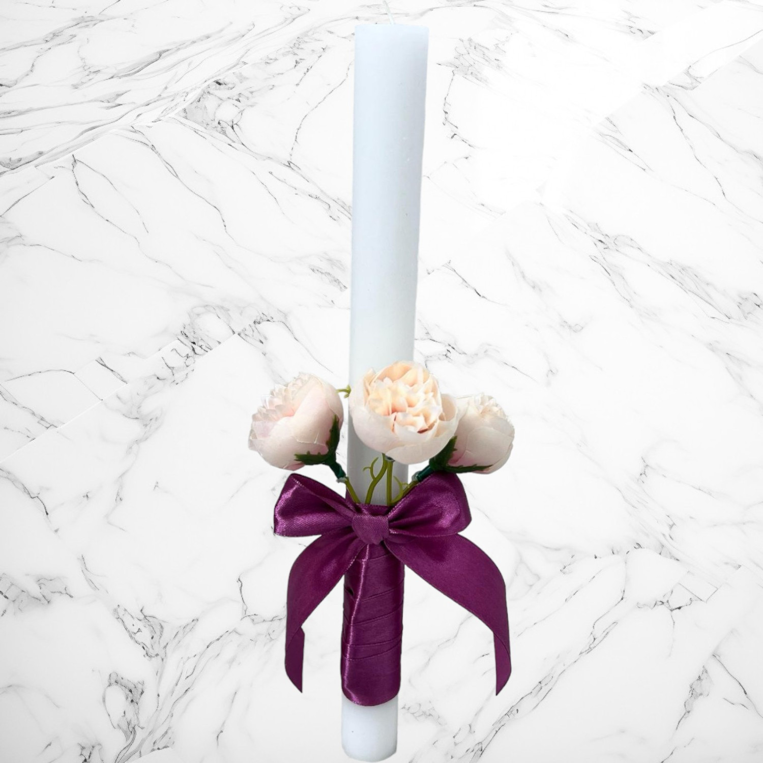 Lumanarea este decorata din flori artificiale bujori si este decorata cu fundita de culoare grena.