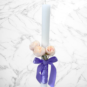 Lumanarea este decorata din flori artificiale bujori si este decorata cu fundita de culoare lila.