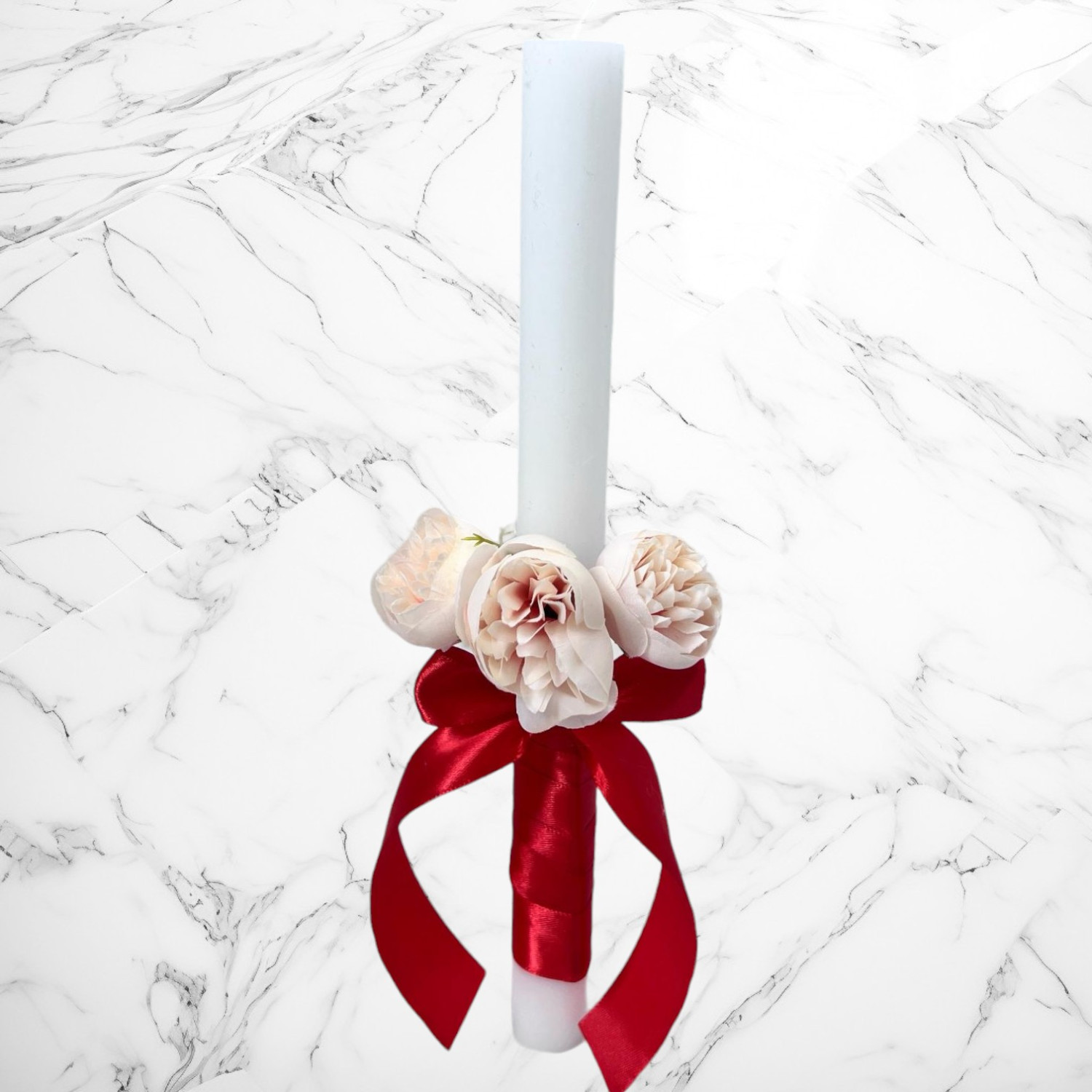 Lumanarea este decorata din flori artificiale bujori si este decorata cu fundita de culoare rosu.