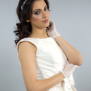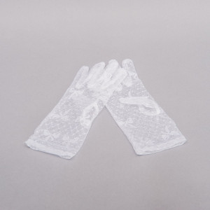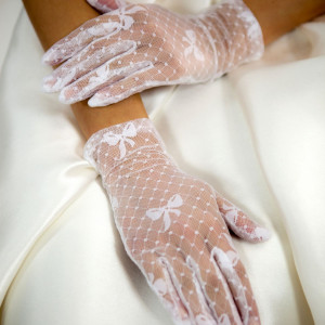 Iti plac manusile scurte din dantela alba cu model? Atunci noi iti propunem sa asociezi rochia de mireasa cu manusi transparente cu model cu fundite. Arata cu adevarat special!