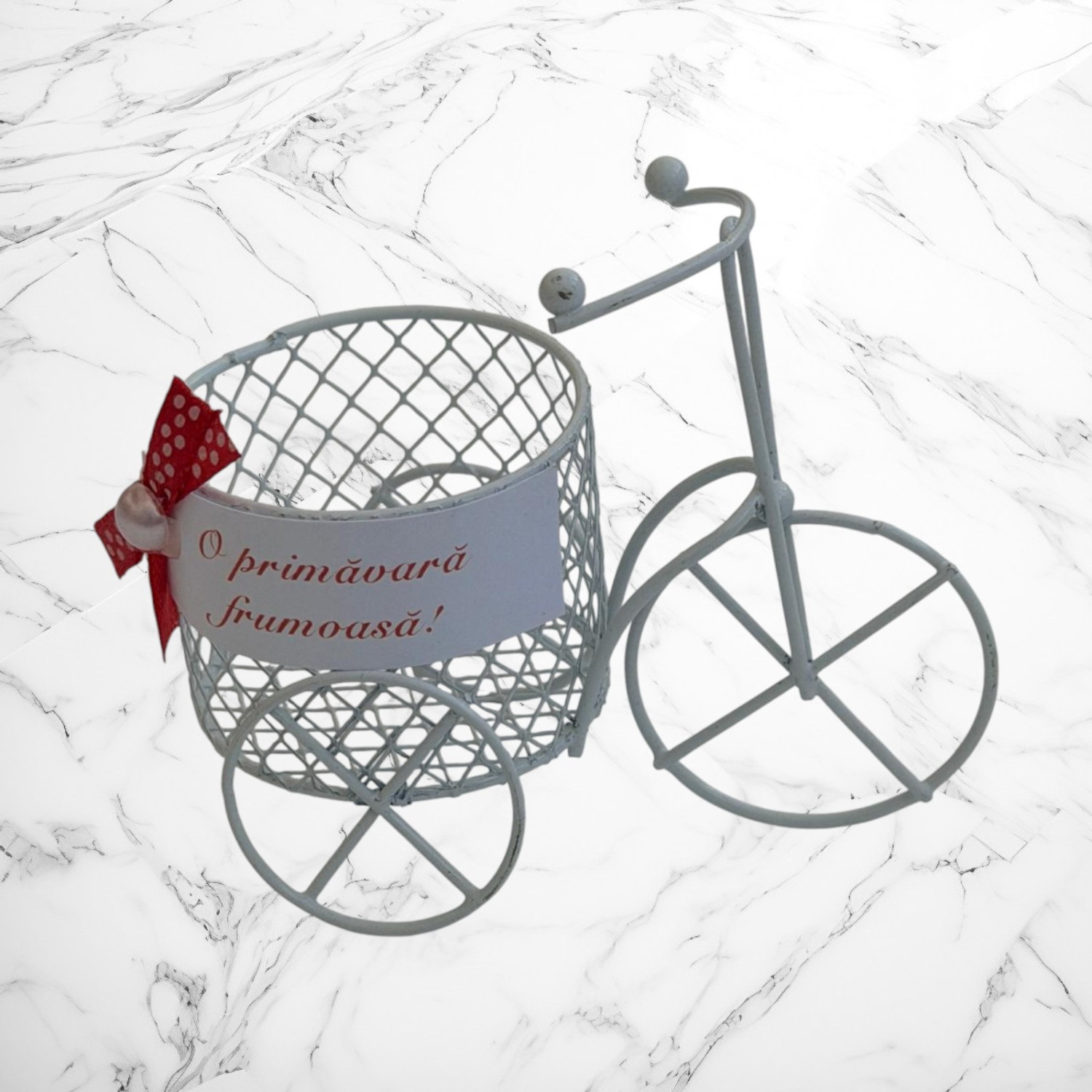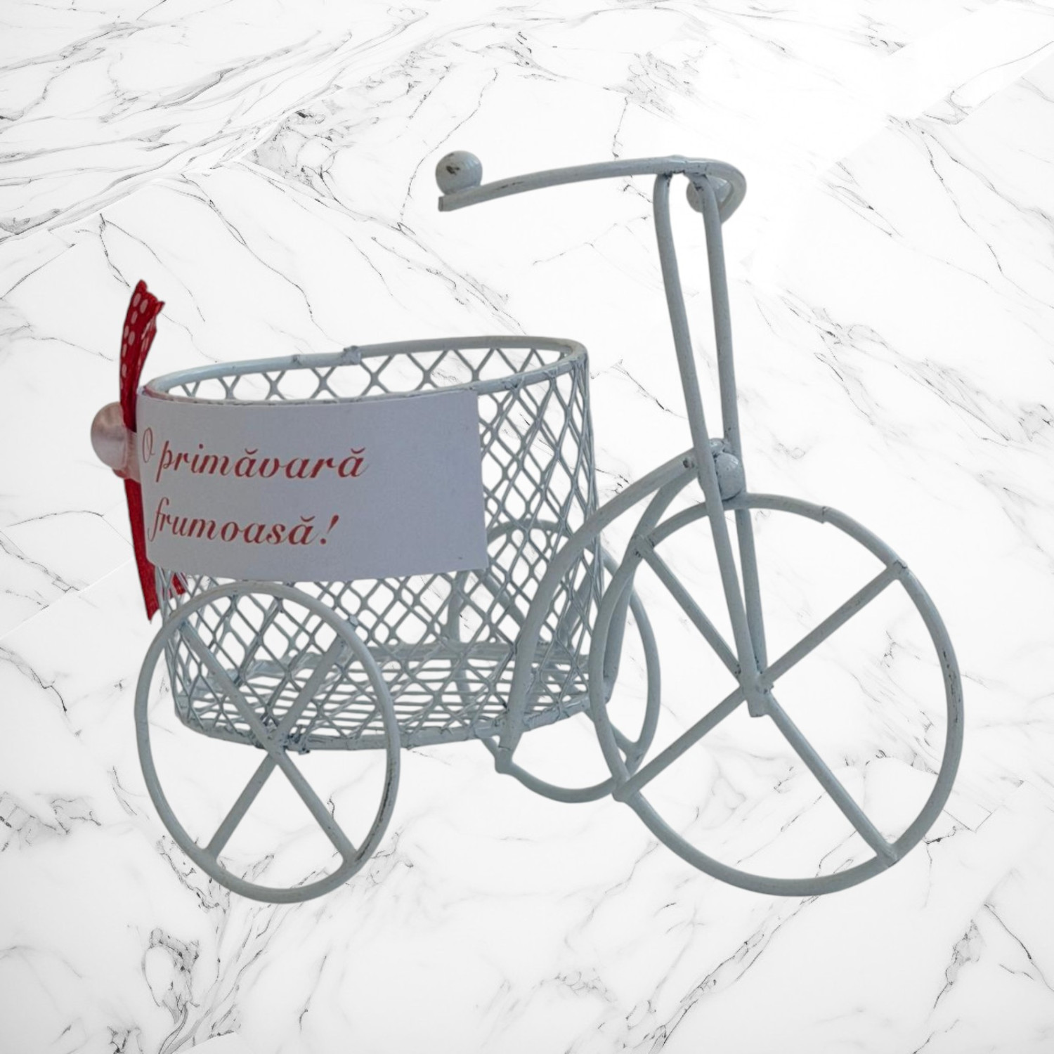 Mărțișor decorativ în formă de bicicletă vintage, realizat din metal, cu coș tip sârmuliță și mesaj „O primăvară frumoasă!”. Un cadou elegant și delicat, perfect pentru 1 Martie sau decor de primăvară.