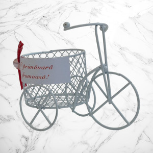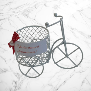 Adu un strop de farmec și prospețime de primăvară în darurile tale cu acest mărțișor decorativ în formă de bicicletă vintage, realizat din metal, cu un coș delicat tip sârmuliță. Designul său romantic este completat de mesajul cald „O primăvară frumoasă!”, prins cu o fundiță roșie cu buline și un mic element decorativ, simbol al norocului și al reînnoirii.