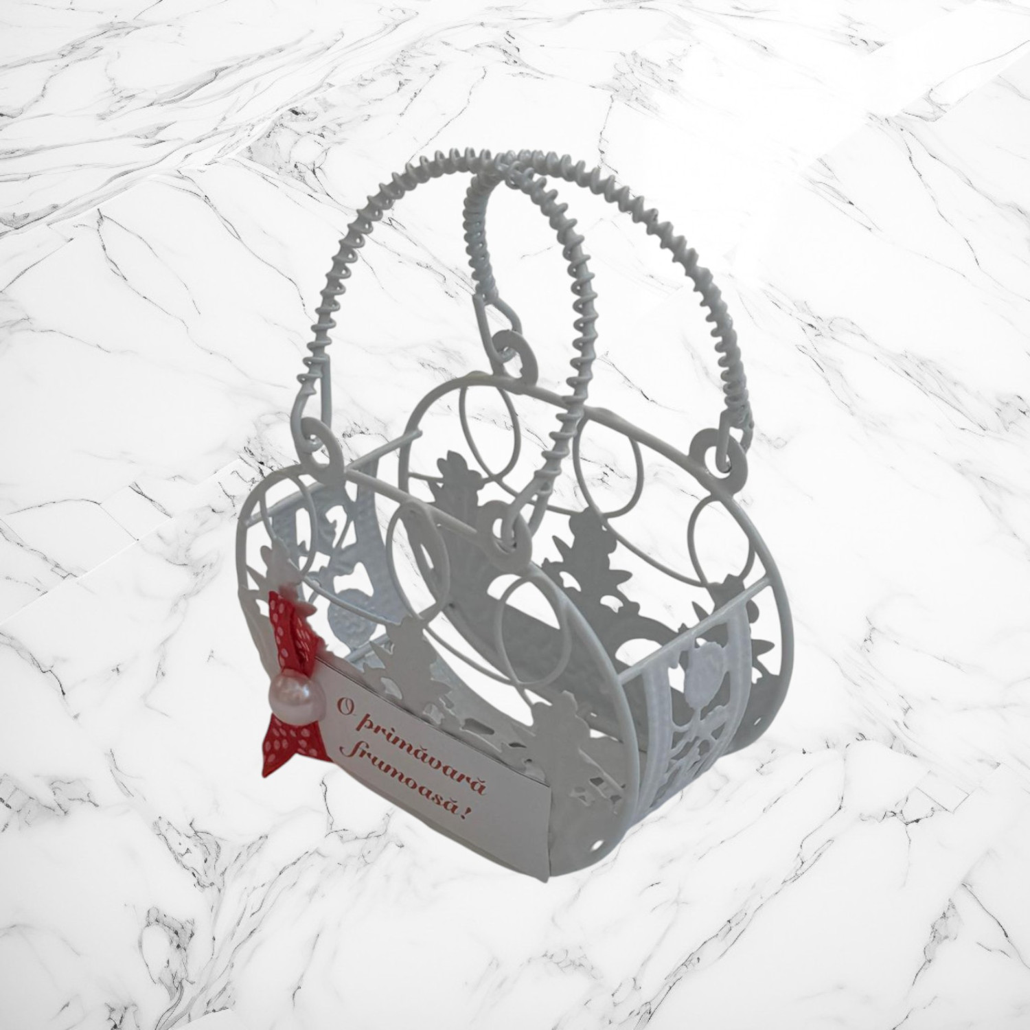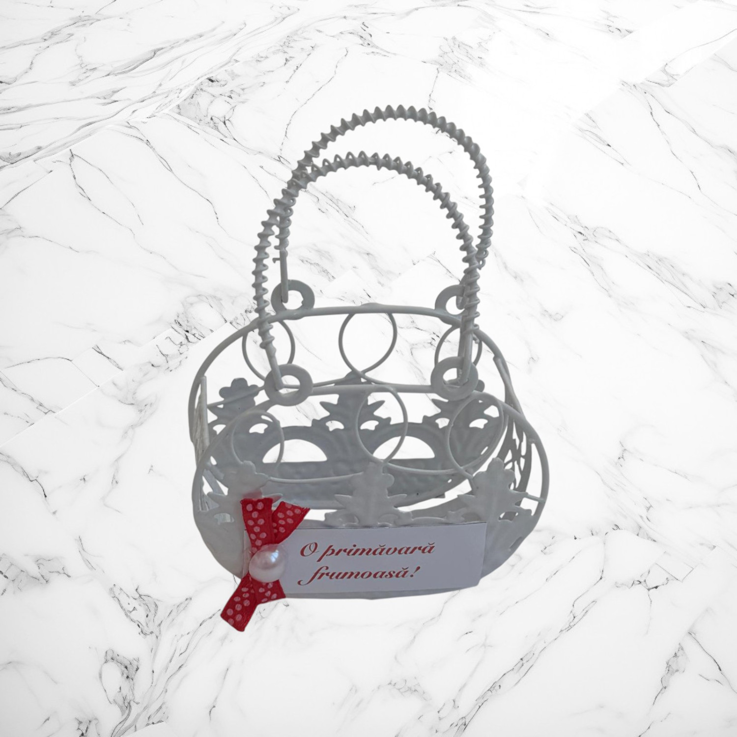 Mărțișor decorativ în formă de gentuță elegantă, realizat din metal tip sârmuliță, cu un design delicat și feminin, inspirat de accesoriile clasice. Este decorat cu o fundiță roșie cu buline, perlă decorativă și mesajul „O primăvară frumoasă!”, care adaugă un accent festiv și simbolic, specific mărțișorului tradițional.