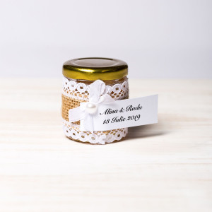 Pentru o nunta in stil rustic, cele mai sugestive cadouri pentru invitati sunt marturiile miere decorate cu banda rafie si fundita si perluta alba. Aceste marturii cu decor manual nu se demodeaza niciodata.