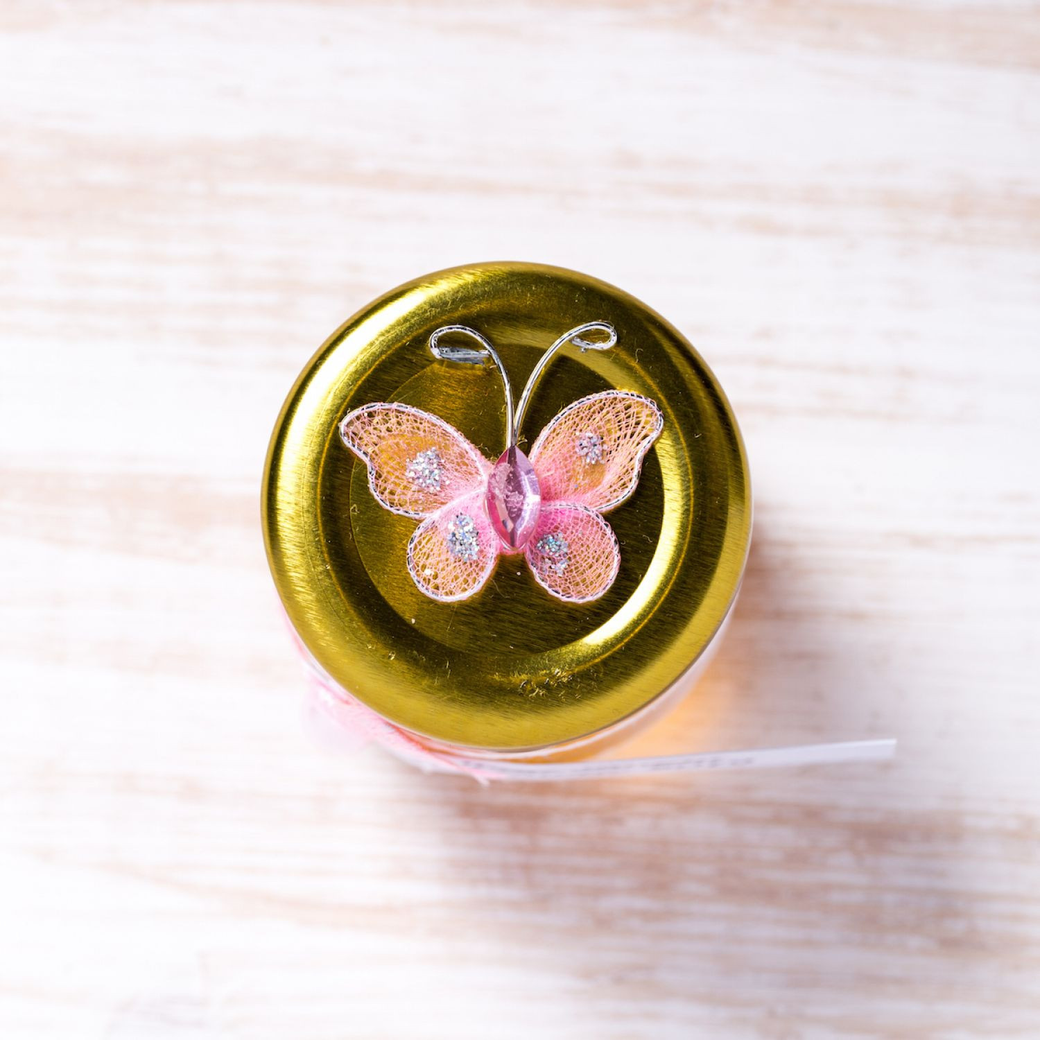 Marturiile borcanele miere decorate festiv cu dantela alba, fundita asortata, perluta si fluture roz reprezinta o alegere inspirata pentru o nunta de primavara-vara.