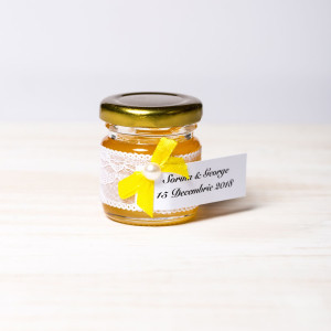 Acestea se ofera in dar invitatilor la restaurant, in semn de multumire pentru prezenta lor la eveniment. In mijlocul funditei este lipita o perluta delicata, ce completeaza decorul borcanelelor cu miere.