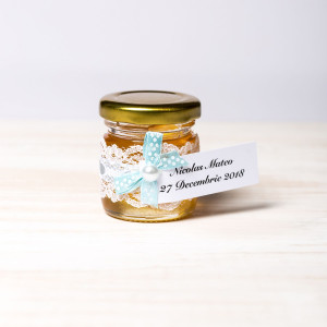 Pentru o nunta programata in sezonul cald sau in plin anotimp alb, marturiile borcanele miere decorate cu dantela alba si fundita bleu cu buline albe reprezinta o alegere potrivita.