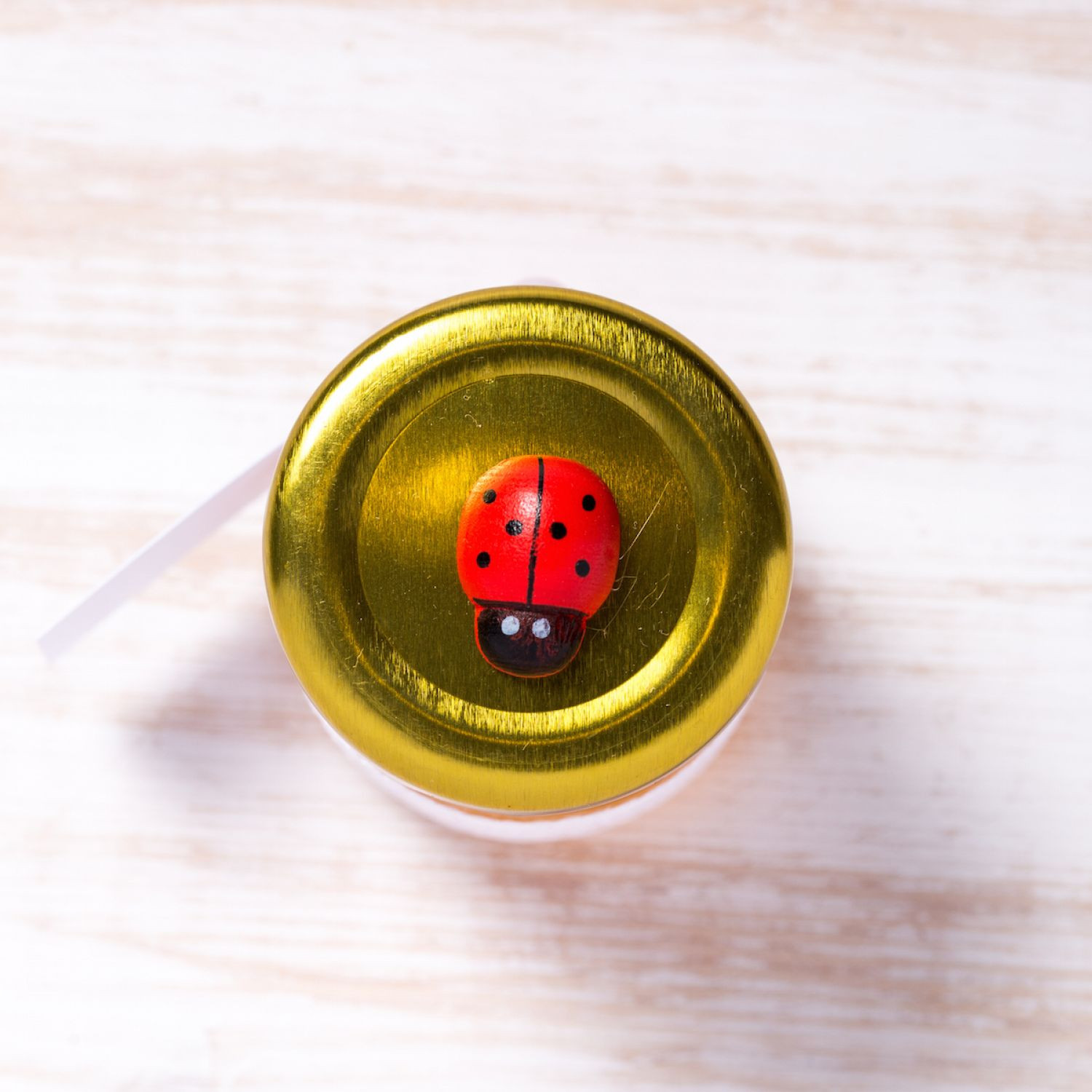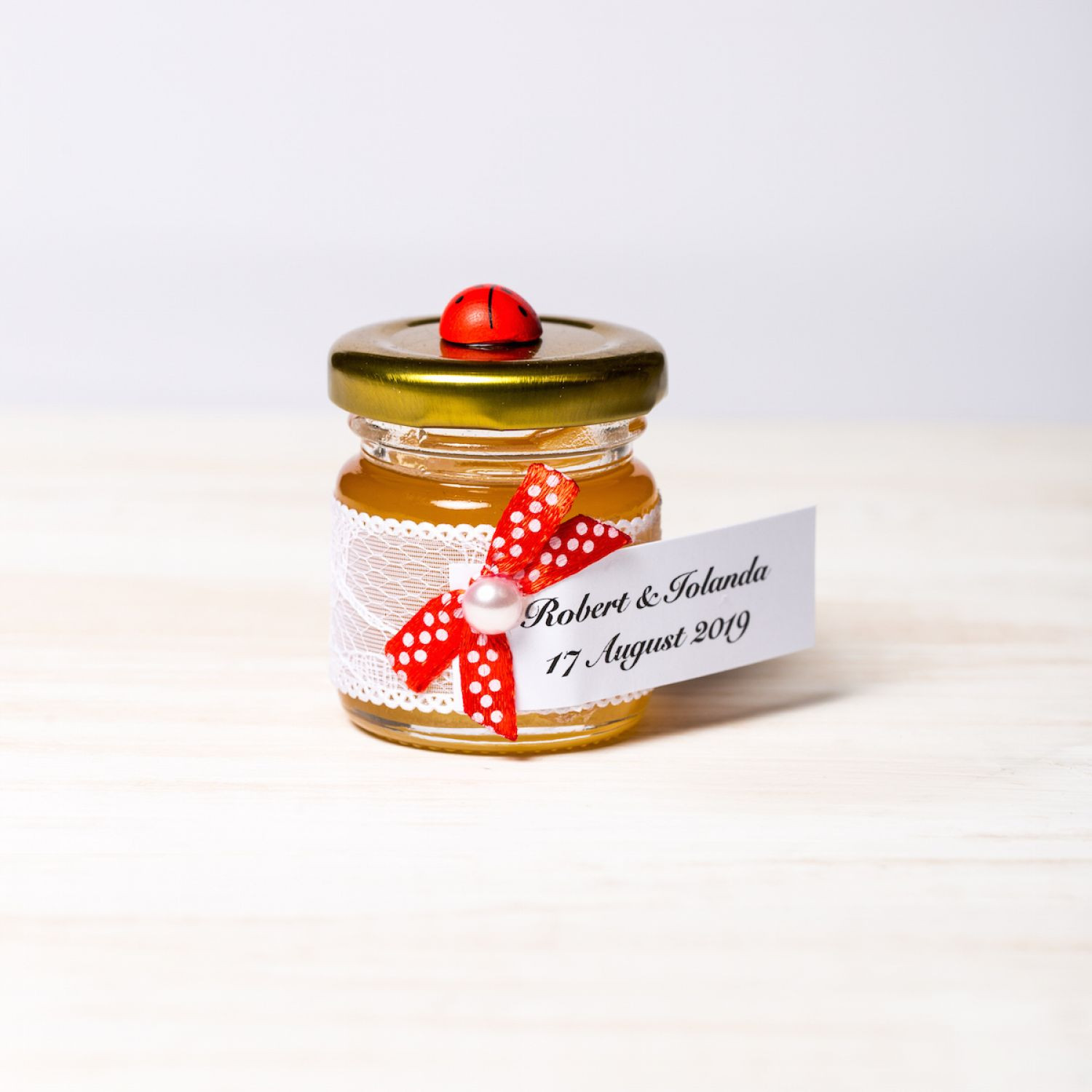 Marturiile borcanele miere sunt cea mai buna alegere, mai ales daca au o figurina vesela pe capac, cum ar fi o buburuza.