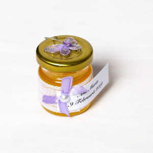 Marturiile de botez borcanele miere cu fluture lila sunt perfecte pentru un botez programat in sezonul cald. Fluturele simbolizeaza renasterea naturii. Fundita lila, dantela alba si perluta asortata intregesc decorul acestor marturii elegante.