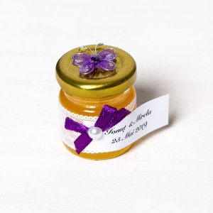Marturiile de botez borcanele miere cu fluture mov sunt perfecte pentru un botez programat in sezonul cald. Fluture simbolizeaza renasterea naturii. Fundita mov, dantela alba si perluta asortata intregesc decorul acestor marturii elegante.