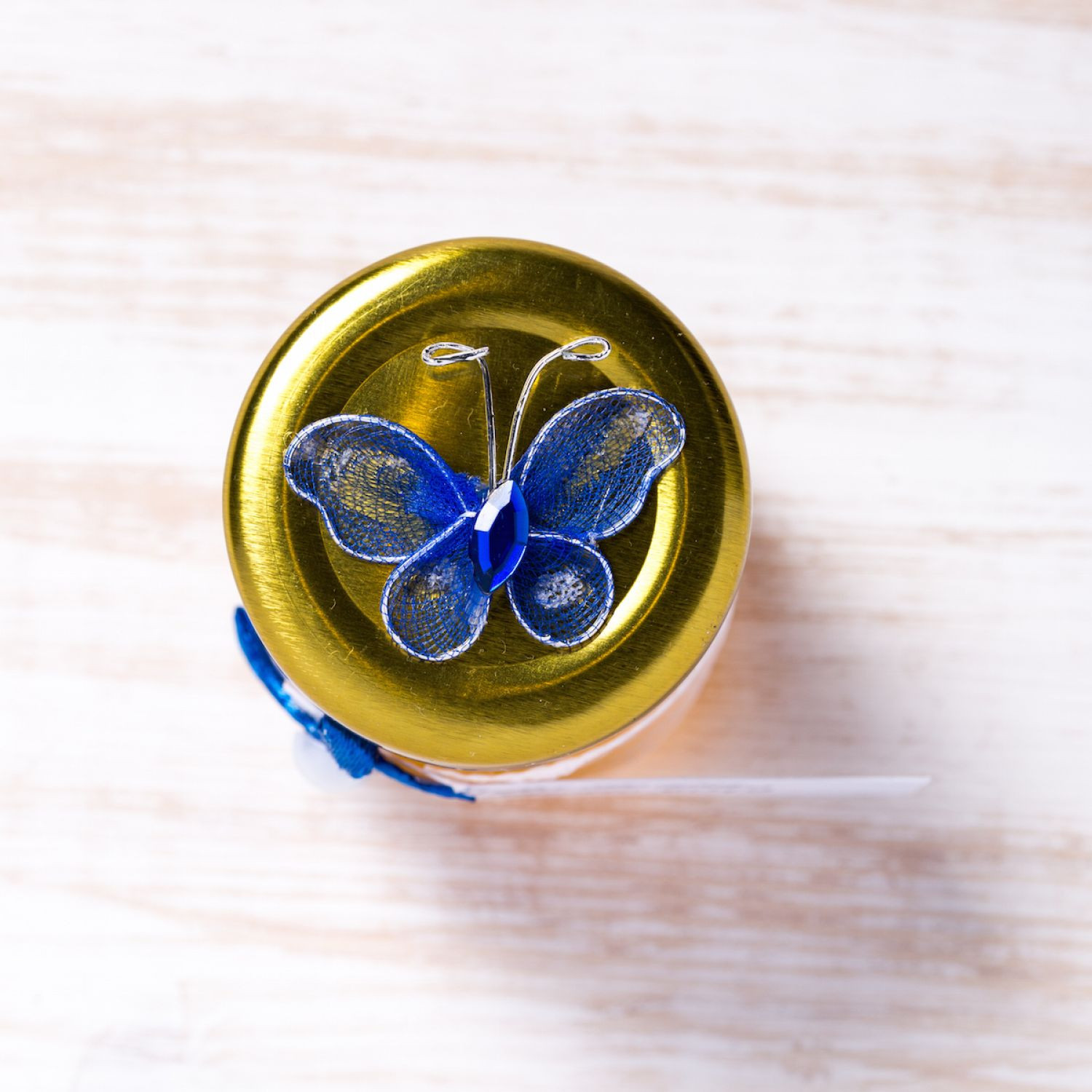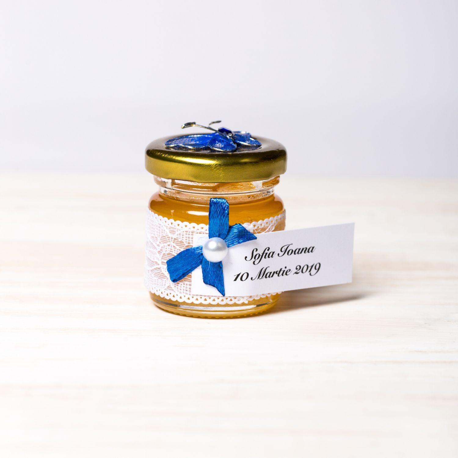 Ofera la prima petrecere importanta din viata ingerasului tau celor prezenti la eveniment marturii borcanele umplute cu miere, decorate festiv cu o banda alba din dantela, fundita albastra cu perluta asortata in mijloc si un fluture dragalas pe capac.