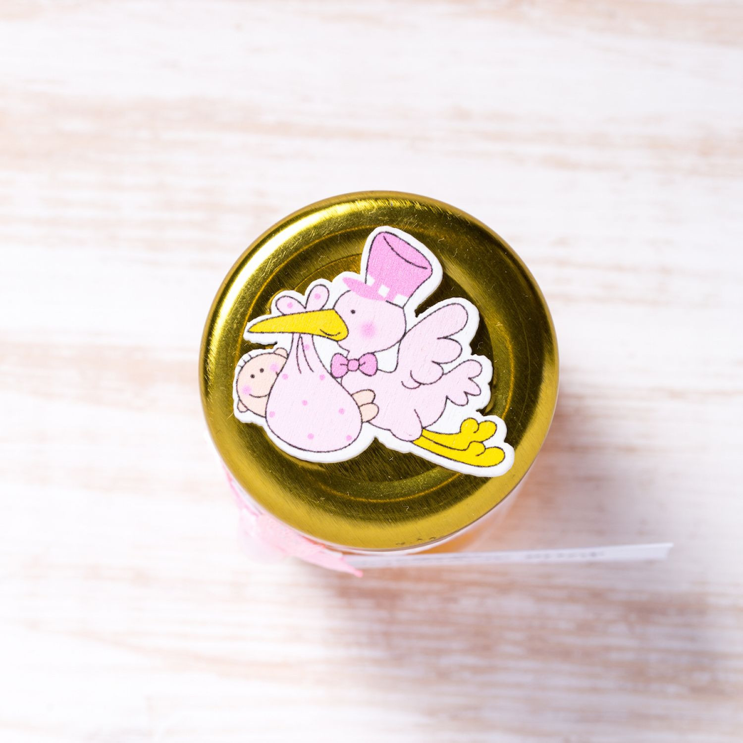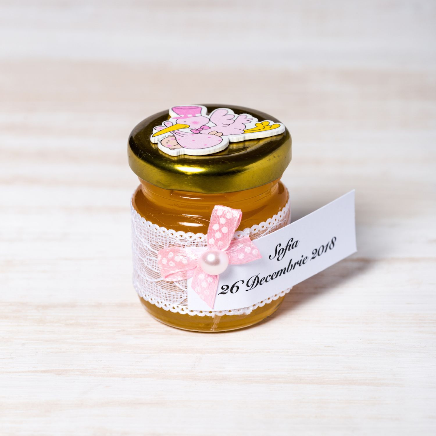 Se apropie mult asteptatul botez al fetitei voastre, iar pentru acest moment special te-ai gandit sa faci o surpriza placuta invitatilor? Atunci ofera celor dragi marturii decorate manual cu o dantela alba, fundita roz cu buline albe si figurina barza roz, lipita pe capac. Barza simbolizeaza nasterea si fecunditatea, aceasta fiind adesea asociata cu aducerea pe lume a unui copil.
