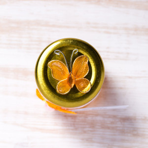 Marturiile borcanele miere care au pe capac o figurina reprezentand un fluture portocaliu sunt sugestive pentru o petrecere programata in sezonul cald.