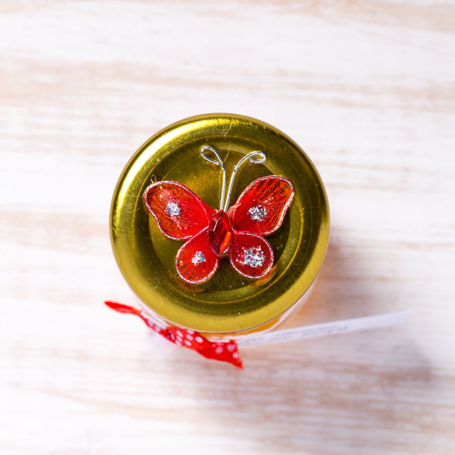Daca vrei sa faci o surpriza frumoasa la petrecerea copilasului tau proaspat crestinat, ofera-le invitatilor prezenti la prima petrecere din viata bebelusului tau marturii botez borcanele miere cu dantela alba, fundita rosie cu buline albe si fluture rosu pe capac.