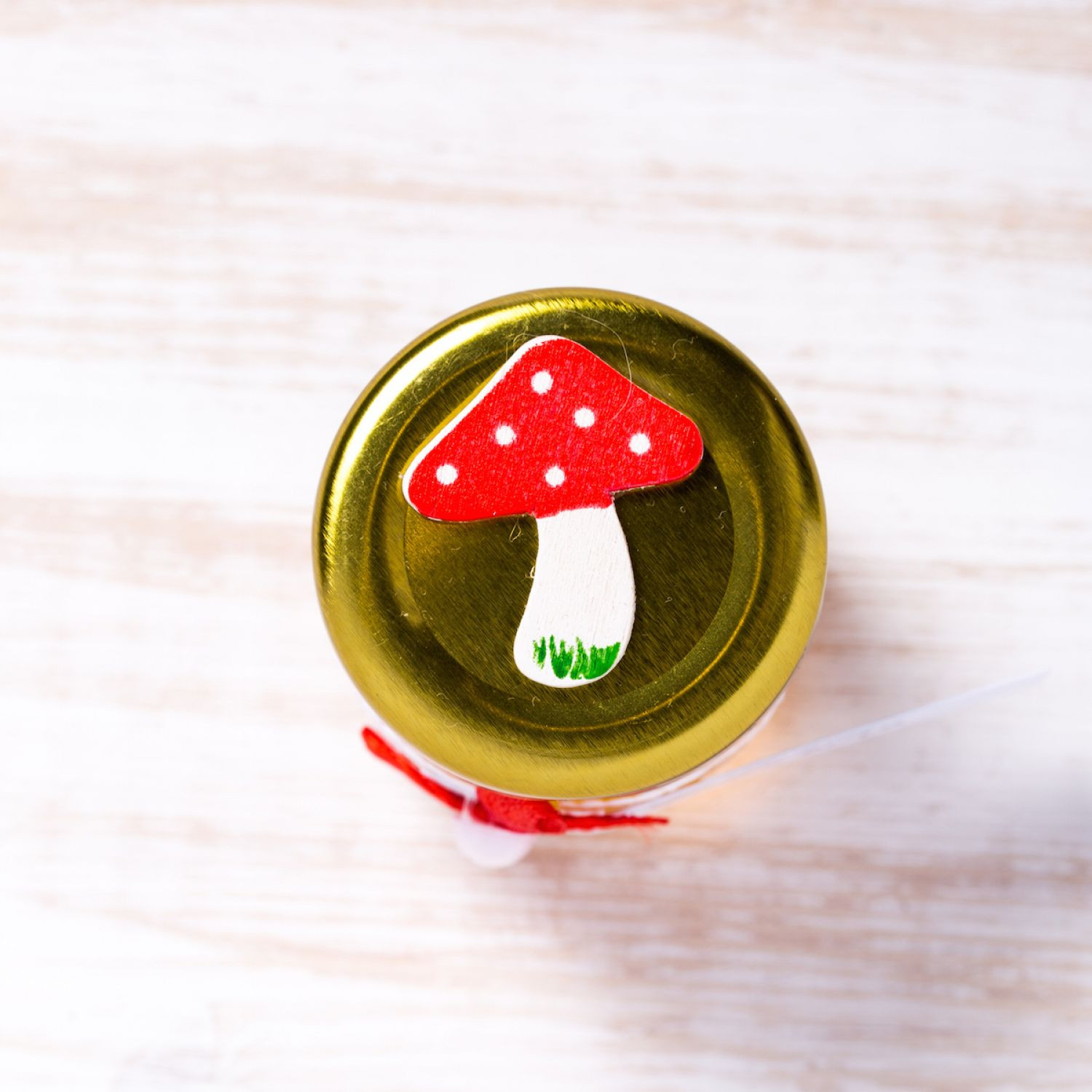 Foarte dragute sunt marturiile de botez borcanele decorate cu o banda lata din dantela alba, fundita rosie si perluta asortata cu ciupercuta de pe capac.