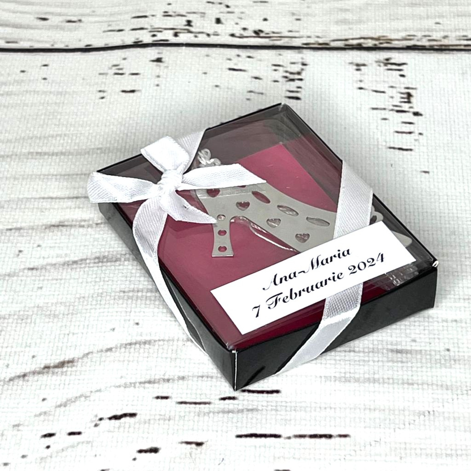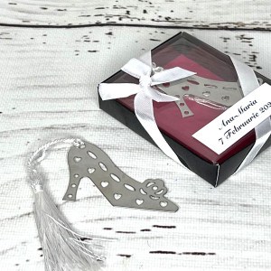 Semnele de carte sunt metalice, ceea ce inseamna ca invitatii se vor bucura de ele mult timp. La spatele pantofului este prins un snur alb, astfel incat cei care citesc sa isi marcheze pagina la care au ramas cu usurinta.