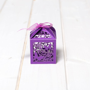 Dupa asamblare, marturiile se umple cu bomboane, apoi se leaga in varf cu o fundita mov din organza. Cutiutele au baza patrata.
