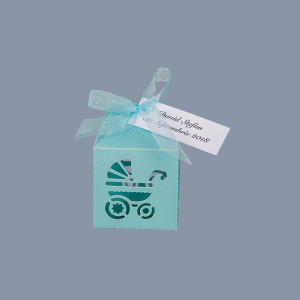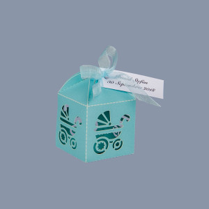 Micile marturii cutiute din carton bleu au baza patrata si se asambleaza usor. Modelul grafic in forma de carucior este realizat prin tehnica laser cut.