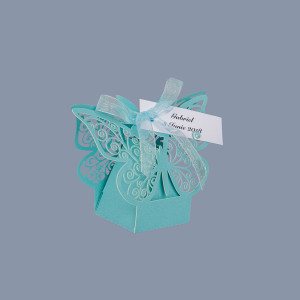 Marturiile cutiutele fluture bleu sunt realizate din carton si au decupaj fluture obtinut prin tehnica laser cut. Aceste marturii cu finisaje impecabile se prind in capat cu un snur din satin asortat.