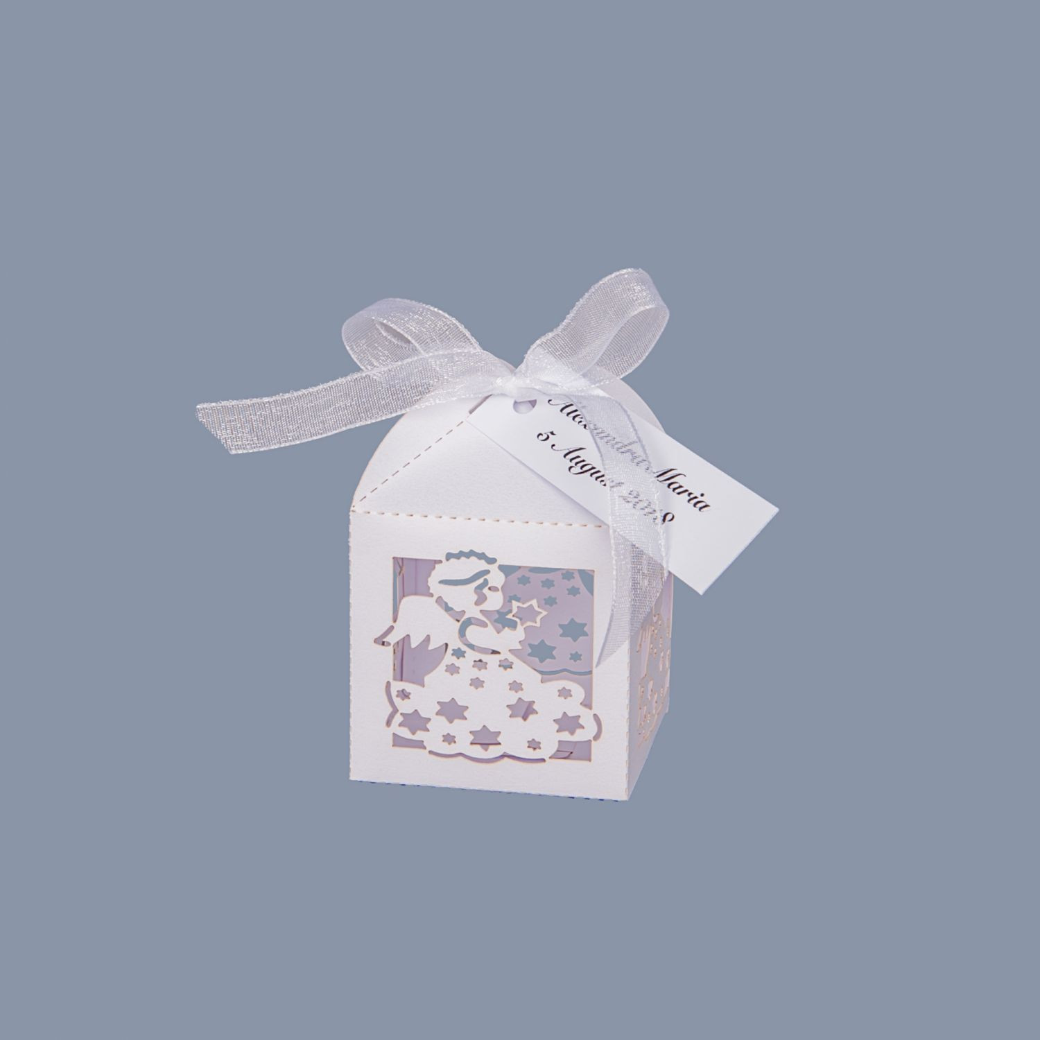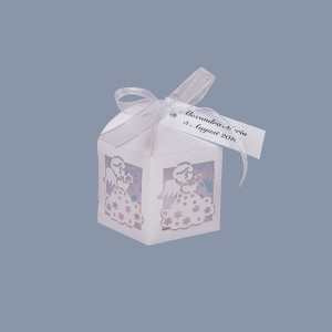 Daca albul imaculat poate fi asociat cu rochia miresei, dar si cu decorul din sala de receptie (pahare miri, casuta dar), ingerasul de pe cutie este atat protectorul proaspetilor insuratei, cat si al invitatilor.