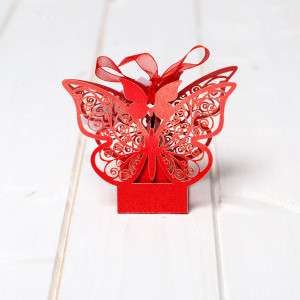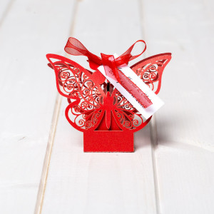 Combina aceste elemente si alege pentru invitatii prezenti la nunta marturii cutiute rosii cu model fluture.