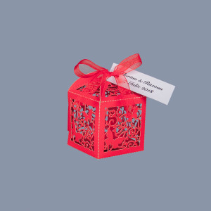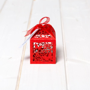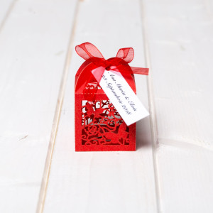 Dupa asamblare, marturiile se umple cu bomboane, apoi se leaga in varf cu o fundita rosie din organza. Cutiutele au baza patrata.