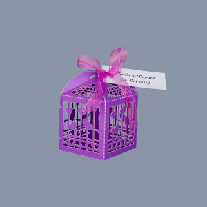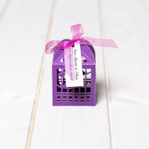 Pentru o nunta regala la castel, cu tema ”Romantism pur”, mirii pot opta pentru marturii dulci, cum sunt cutiutele cu decupaj vrabii si inimi de culoare mov.