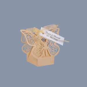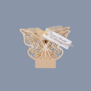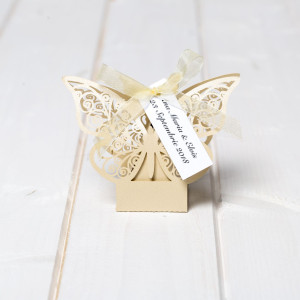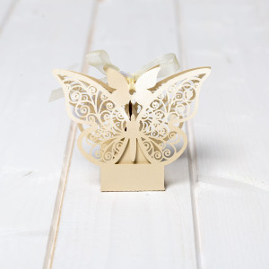 Pentru o nunta clasica sau in stil traditional la care mireasa poarta o rochie ivory, iar paharul mirilor are decor in aceasta culoare neutra, marturiile de nunta cutiute fluture oferite invitatilor pot fi cu siguranta ivory.