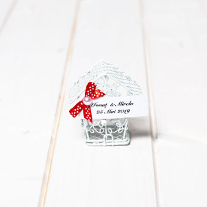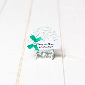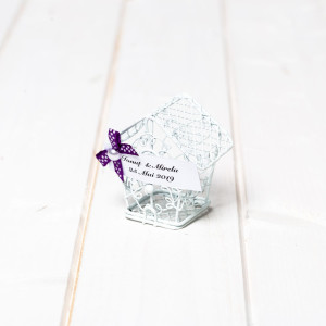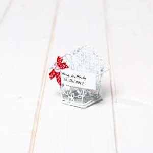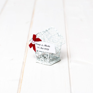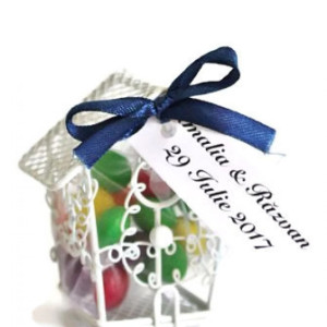 Optional, casutele pot fi accesorizate cu fundita si eticheta pe care este trecut numele mirilor si data evenimentului.