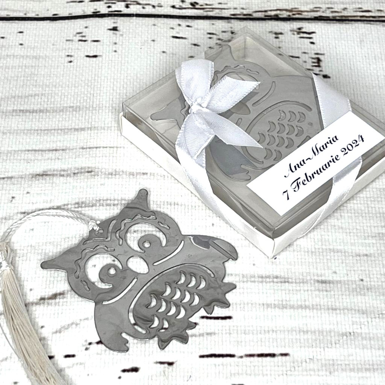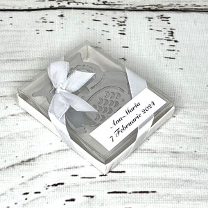 Marturiile de nunta semn de carte bufnita alb sunt alegerea perfecta pentru nuntile cu tema Lectura.