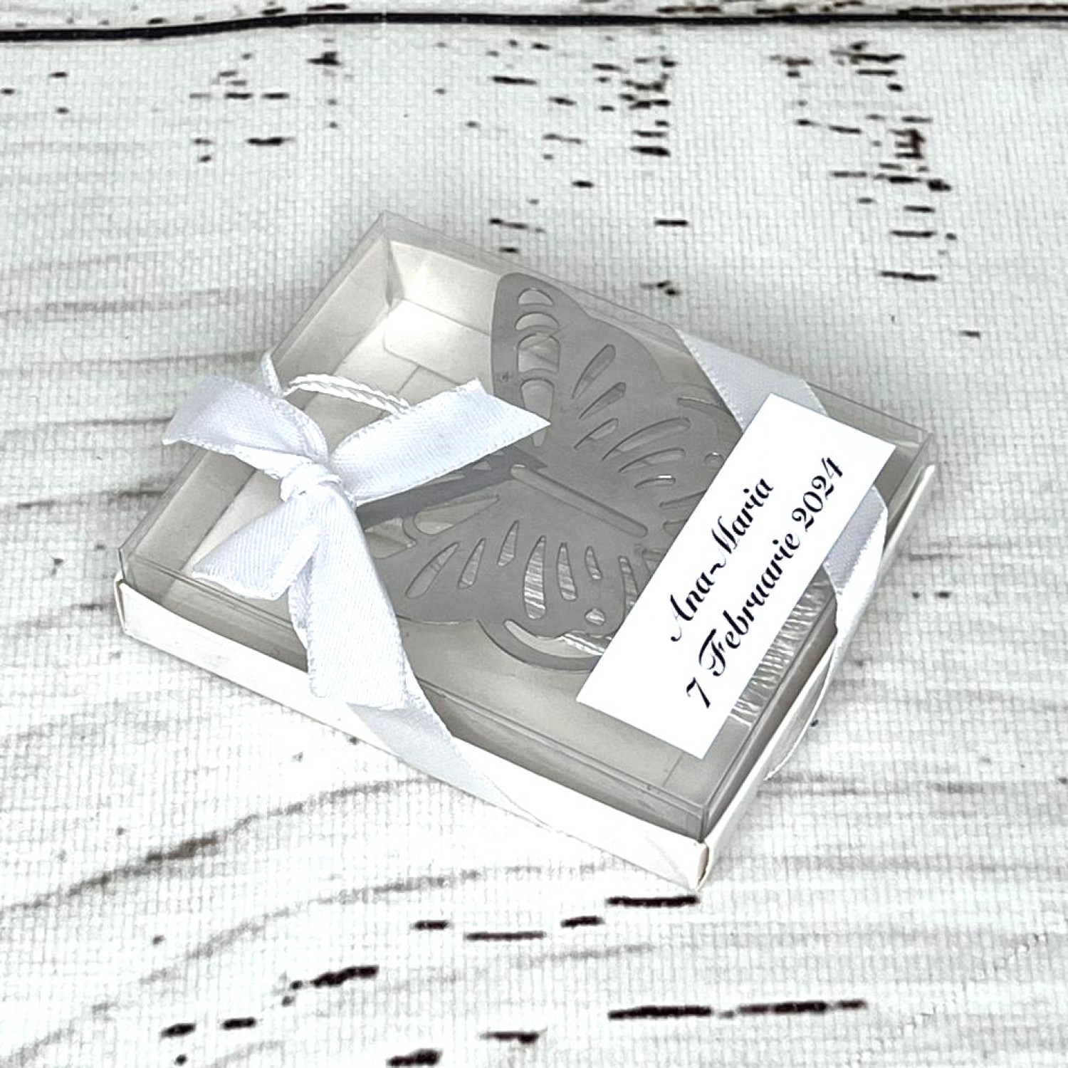 Marturiile de nunta fluture sunt ambalate in cutiute cadou elegante si decorate cu snur.