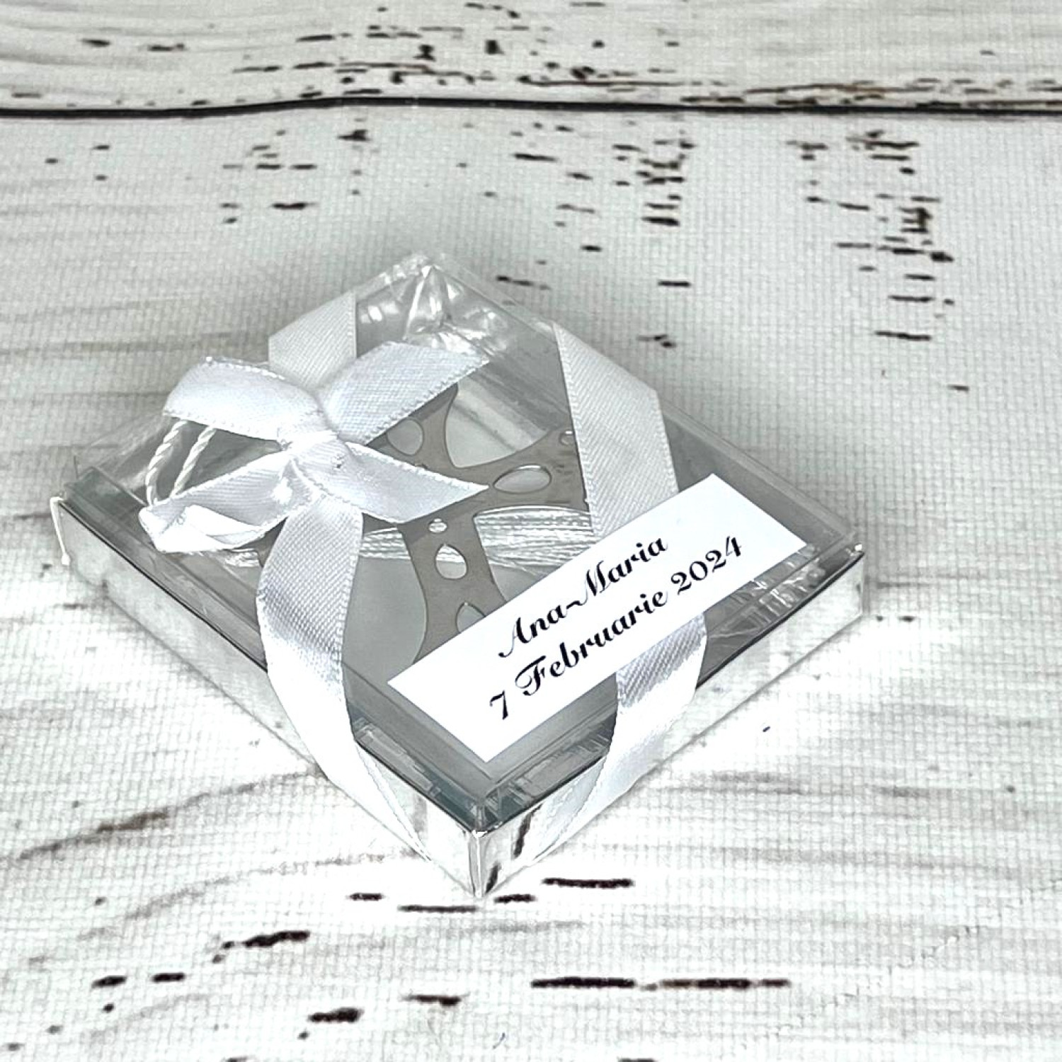 Marturiile semne de carte cruce sunt realizate din metal argintiu, mult mai rezistent decat cartonul si au la capat ciucur alb. Cruciulitele se ofera in cutii de carton cu capac de plastic transparent, pentru vizualizarea produselor.