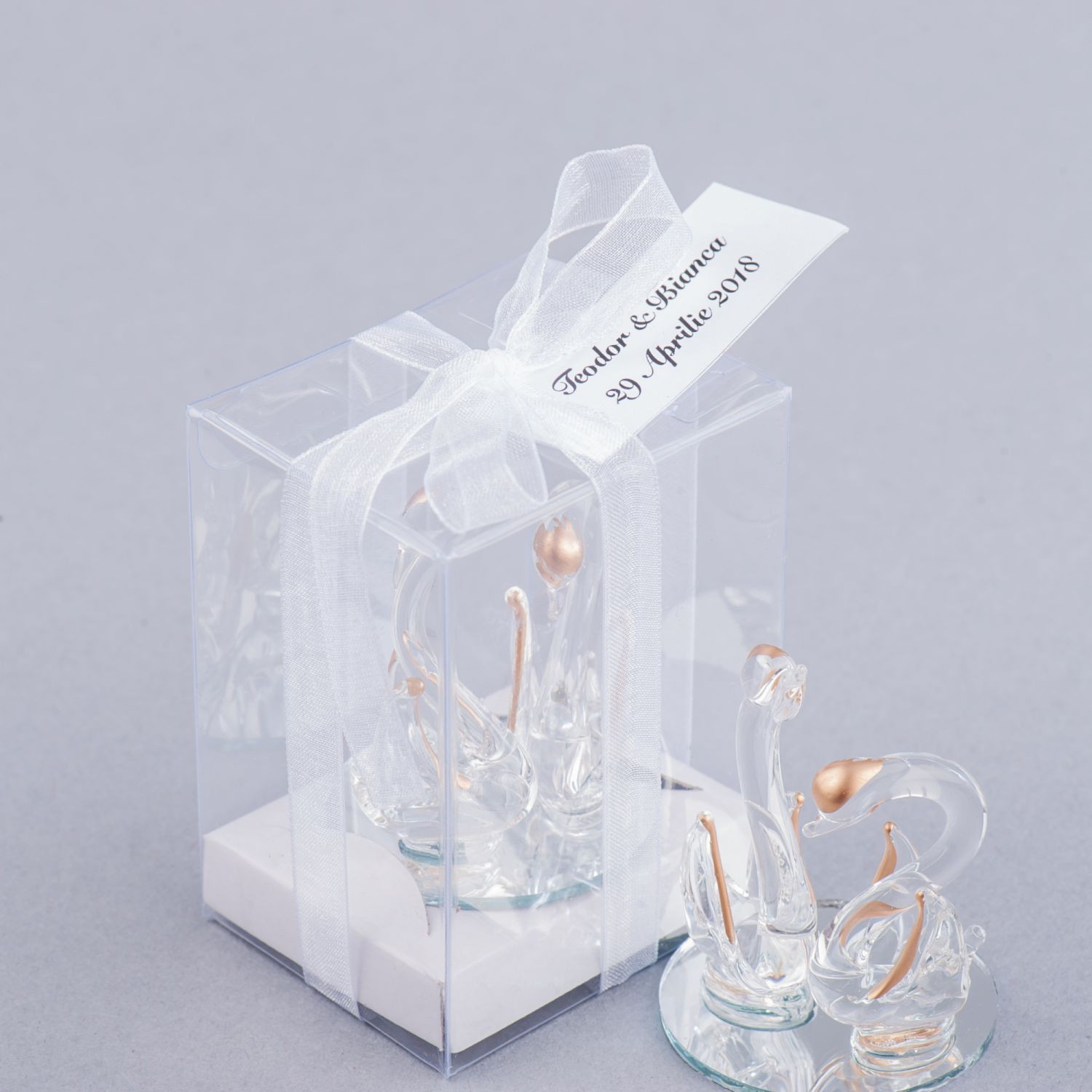 Marturiile nunta lebede se ofera personalizate cu fundita si eticheta. Pe cartonas se trece numele mirilor si data evenimentului.