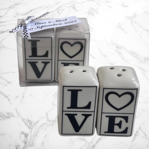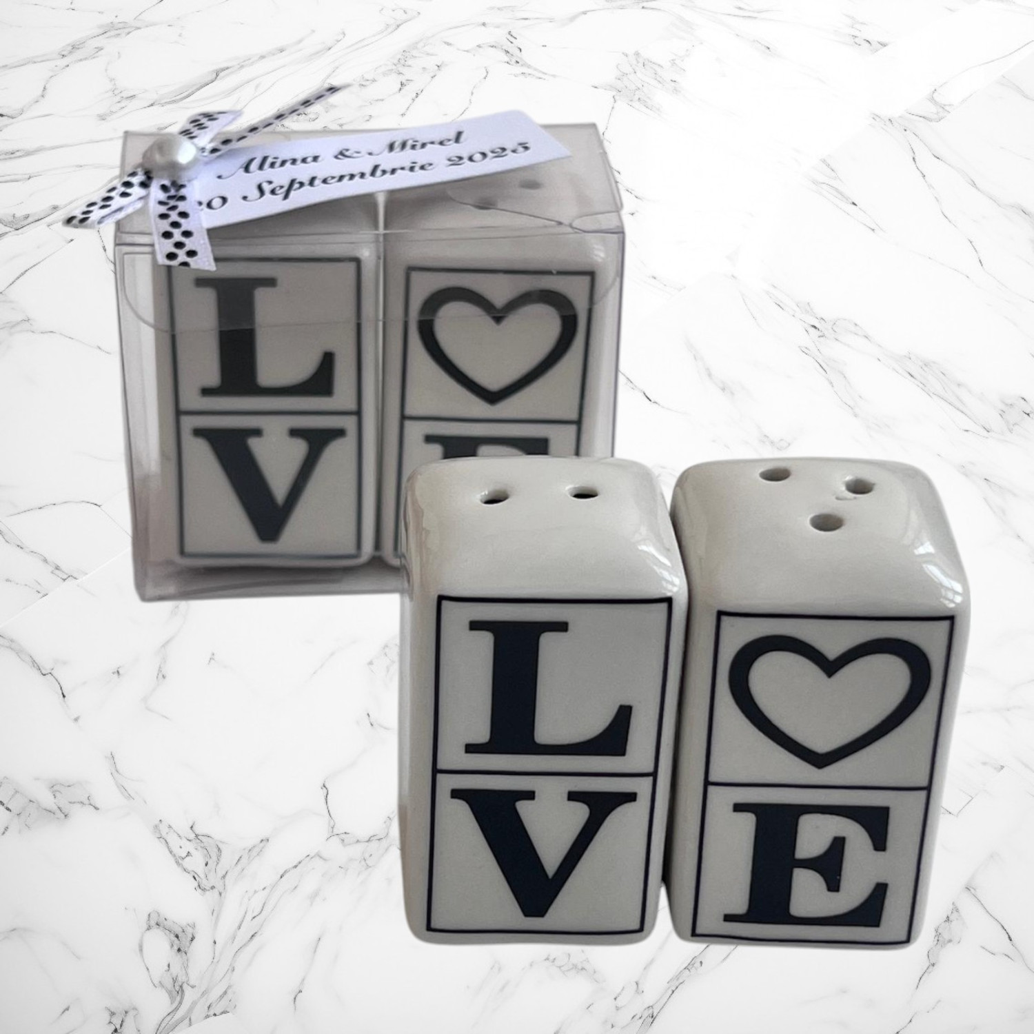 Spune-le invitaților “Mulțumim cu dragoste” printr-un cadou original, practic și plin de semnificație! Acest set de solnițe din ceramică scrie LOVE în cel mai dulce mod – perfect pentru o nuntă romantică sau un botez cu tematică elegantă. 💑
