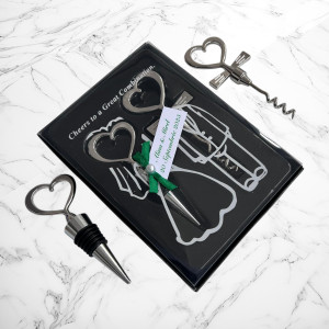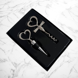 Un set elegant și cu adevărat de efect! Acest cadou format din dop de sticlă și tirbușon cu mâner în formă de inimă este o alegere rafinată și practică pentru invitații de la nunta voastră.