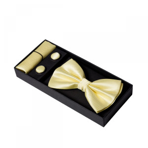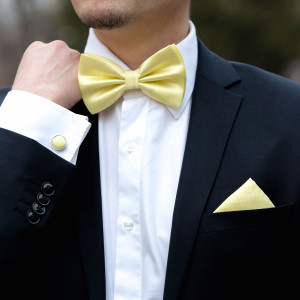 Setul de nunta format din papion cu sistem de prindere care se regleaza pe orice dimensiune, butoni de camasa rotunzi si batista de buzunar in nuante de galben este cadoul perfect pentru un viitor mire care adora soarele si culorile calde.