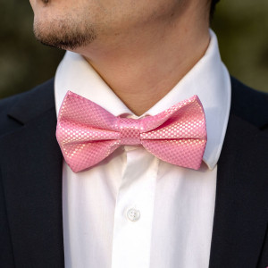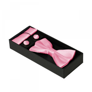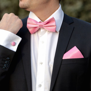 Set de ocazie roz format din trei accesorii decorative irezistibile, ce innobileaza tinuta oricarui barbat elegant: papion, batista si butoni camasa.