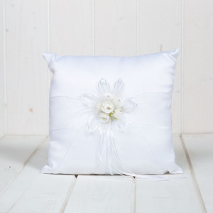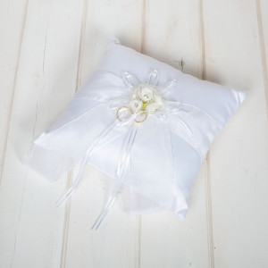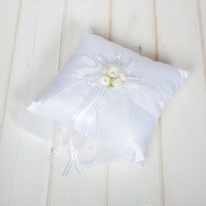 Pernuta pentru verighete alba din tulle cu trandafiri in mijloc, sub forma unui buchetel elegant este ideala pentru cununia religioasa.