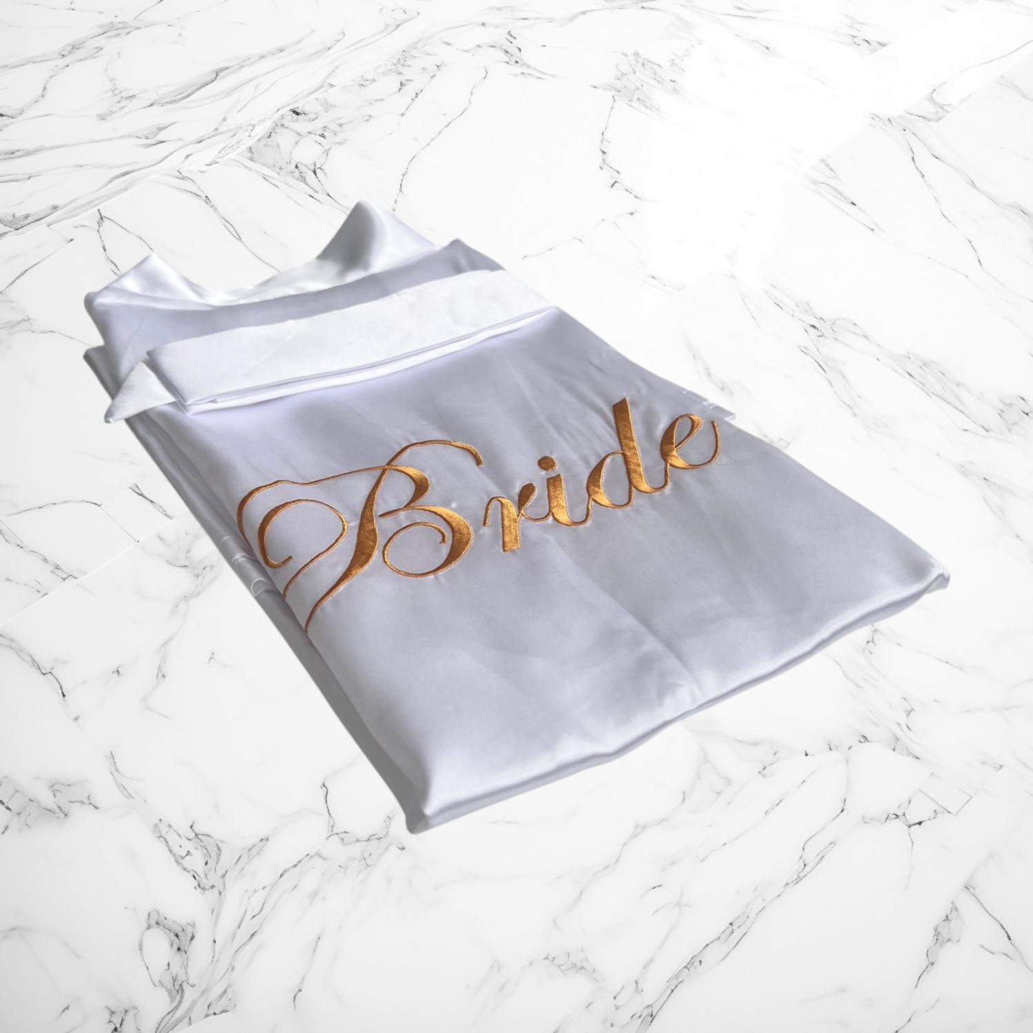 Realizat dintr-un satin fin, cu o textură lucioasă și lejeră, acest halat alb este inscripționat cu „Bride” în nuanță aurie – un detaliu chic care adaugă un plus de farmec și eleganță.