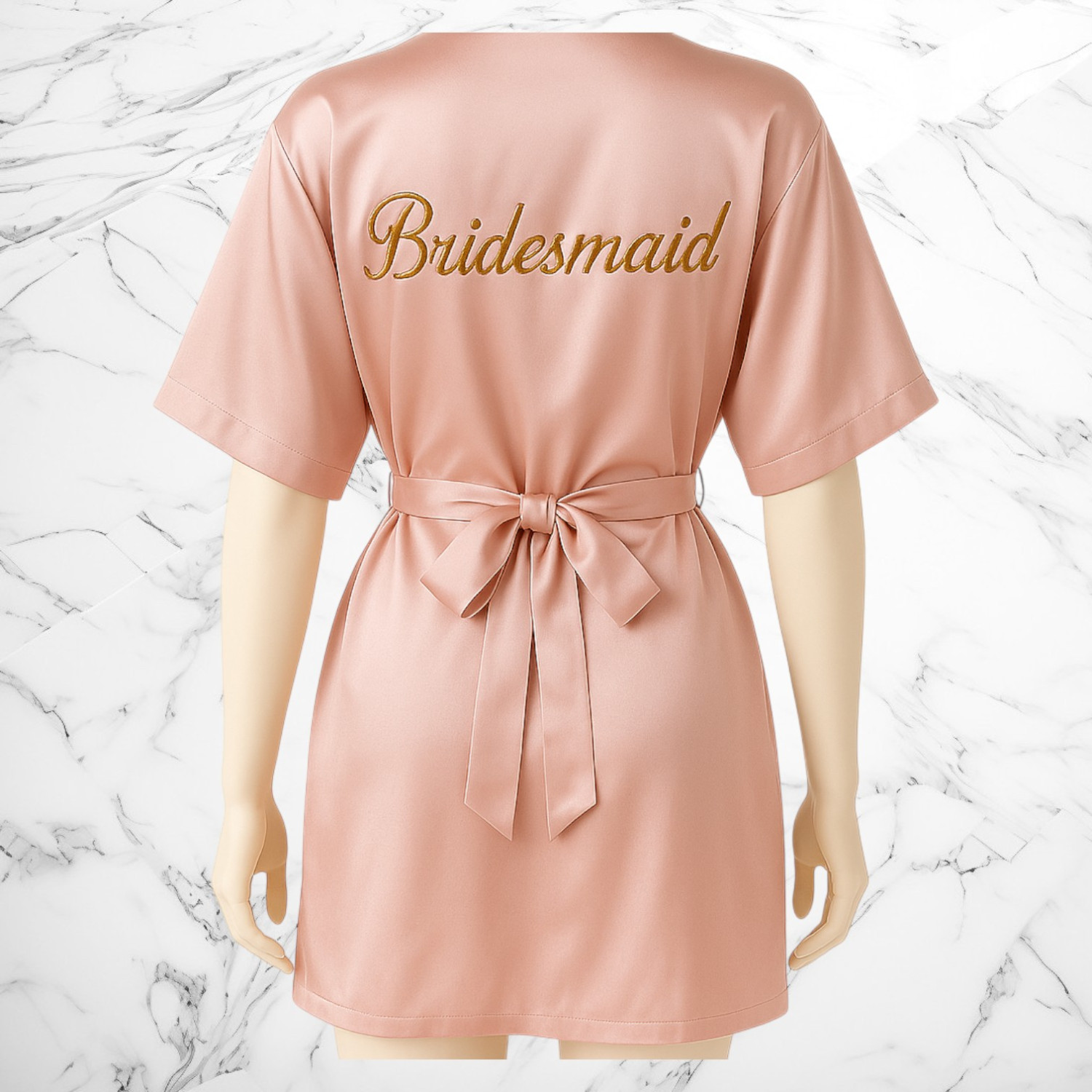 Realizat dintr-un material mătăsos și fin, halatul are inscripția aurie "Bridesmaid" pe spate, un croi lejer și o centură care accentuează delicat talia.