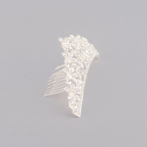 O poti face cu ajutorul unui pieptan cu flori realizat din material metalic inoxidabil de culoare argintie decorat cu cristale si mici strassuri.